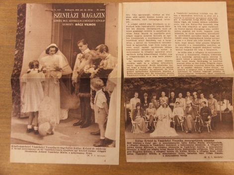 Kállay Miklós miniszterelnök bizantikus gazdagságú díszmagyarban és felesége, káprázatóan finom, aprólékos csipkéből gazdag és mély, tüzes színű magyaros ruhájában beszélget az örömszülőkkel, - kézdivásárhelyi Vásárhelyi Andrással és feleségével, - mácsai CSERNOVICS Eszterrel.